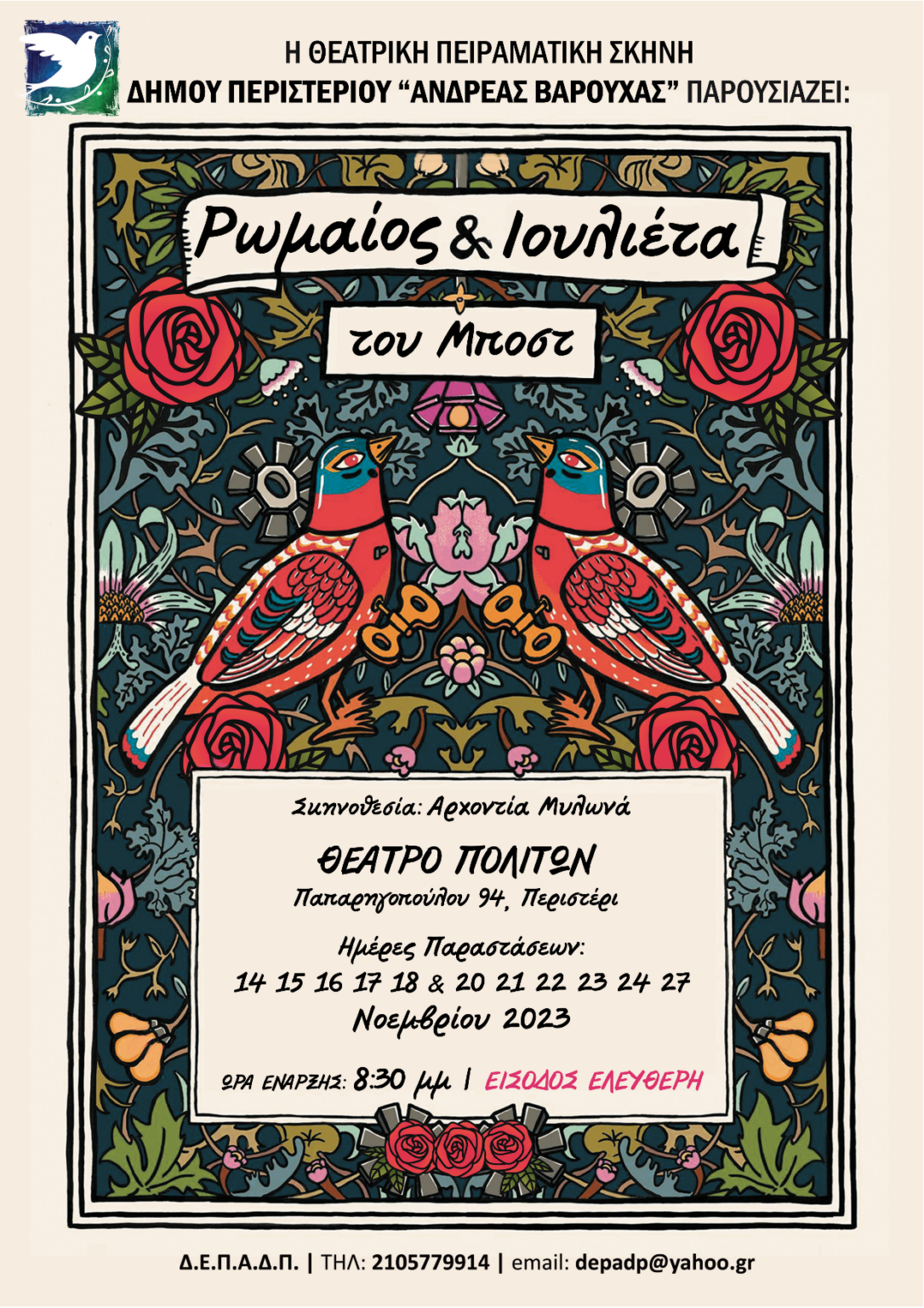 Επανέναρξη των παραστάσεων του έργου «Ρωμαίος & Ιουλιέτα» του Μποστ, σε σκηνοθεσία Αρχοντίας Μυλωνά από τη Θεατρική Πειραματική Σκηνή «Ανδρέας Βαρούχας» του Δήμου Περιστερίου, 22 έως 24 και 27 Νοεμβρίου 2023, ώρα 20:30, στο Θέατρο Πολιτών. Είσοδος Ελεύθερη!