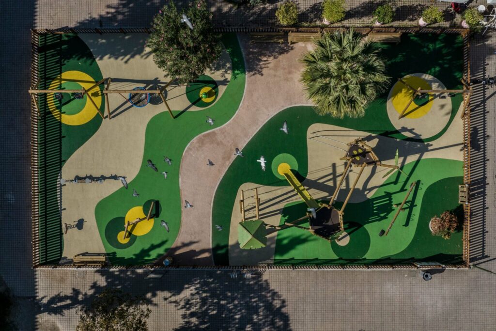 Στην παιδική χαρά σχεδιάστηκε ειδικός χώρος για τα νήπια, ενώ το σύνολο των παιχνιδιών και των οργάνων έχουν τοποθετηθεί σε χυτό δάπεδο ασφαλείας. Ο πλήρης και σύγχρονος εξοπλισμός που διαθέτει ο χώρος, δίνει τη δυνατότητα στους μικρούς επισκέπτες να περάσουν ξέγνοιαστες στιγμές χαλάρωσης και παιχνιδιού.