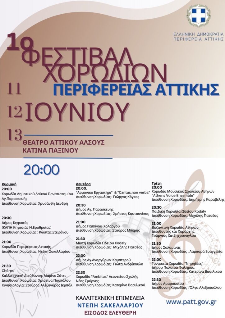 Η Περιφέρεια Αττικής κατόπιν σχετικής πρωτοβουλίας του Περιφερειάρχη Γ. Πατούλη διοργανώνει, το 1ο Φεστιβάλ Χορωδιών Περιφέρειας Αττικής στις 11- 12 και 13 Ιουνίου στο θέατρο Αττικό Άλσος, «Κατίνα Παξινού».