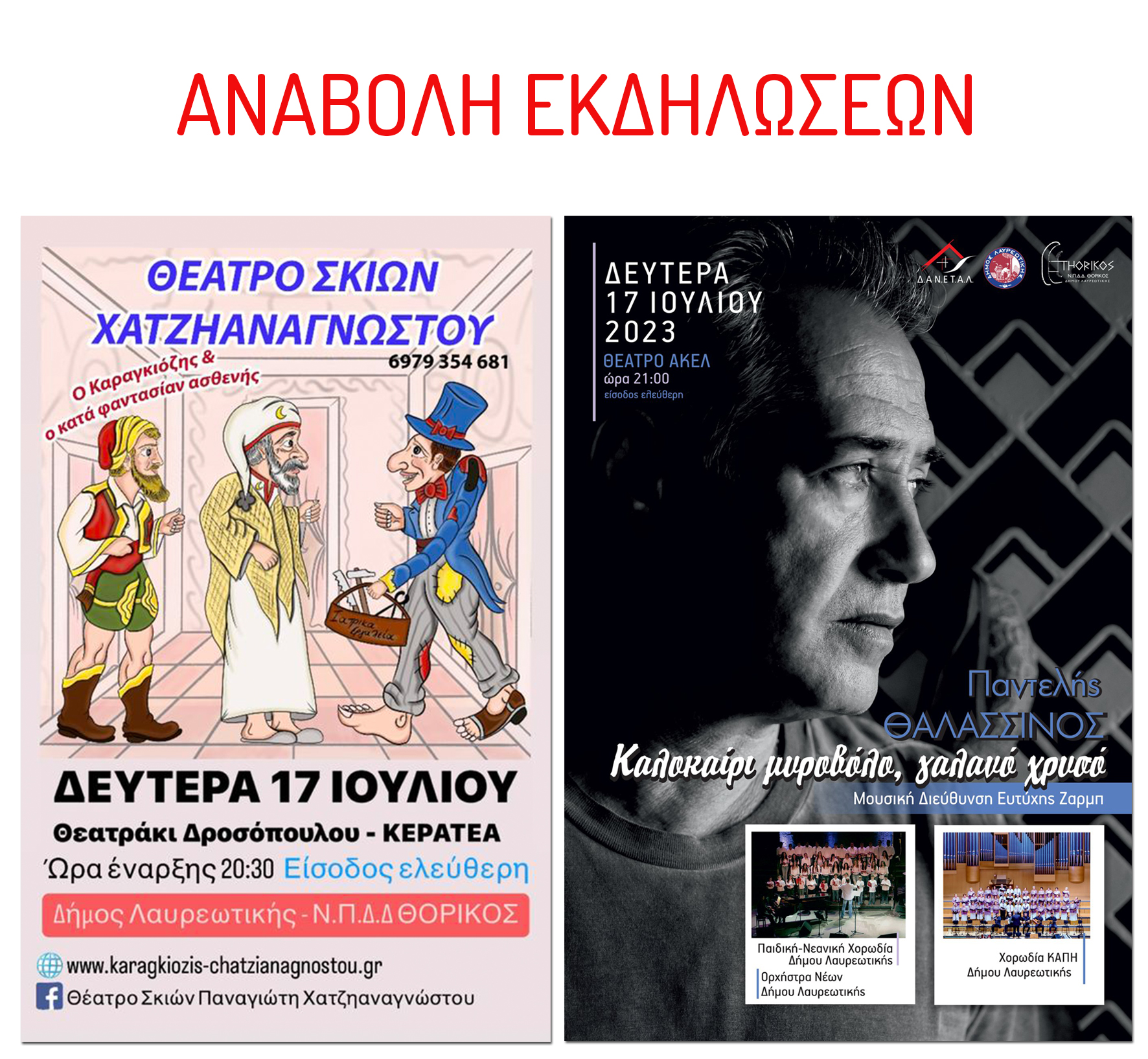 Ο Δήμος Λαυρεωτικής ενημερώνει, ότι οι παρακάτω εκδηλώσεις που ήταν προγραμματισμένες να διεξαχθούν σήμερα, Δευτέρα 17 Ιουλίου 2023, αναβάλλονται λόγω της σημερινής, μεγάλης πυρκαγιάς. Συγκεκριμένα: