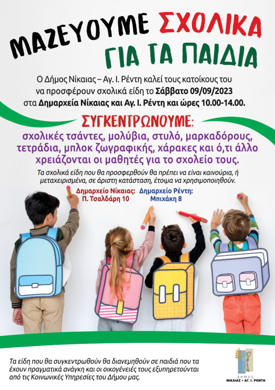 Σχολικά είδη για τις ευάλωτες κοινωνικές ομάδες συγκεντρώνει ο Δήμος Νίκαιας-Αγ.Ι.Ρέντη, το Σάββατο 9 Σεπτεμβρίου από τις 10 το πρωί έως τις 2 το μεσημέρι στα Δημαρχεία Νίκαιας (Π. Τσαλδάρη 10) και Ρέντη (Μπιχάκη 8).