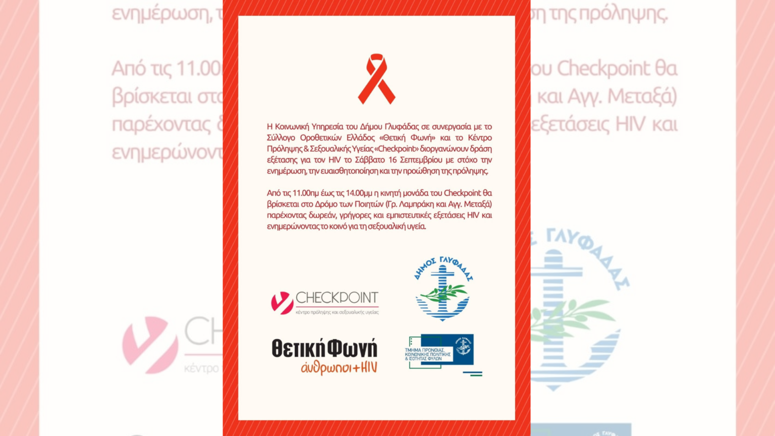 Ο Δήμος Γλυφάδας μέσω της Κοινωνικής του Υπηρεσίας, σε συνεργασία με το Σύλλογο Οροθετικών Ελλάδας «Θετική Φωνή» και το Κέντρο Πρόληψης και Σεξουαλικής Υγείας «Checkpoint», σας προσκαλούν το ερχόμενο Σάββατο, 16 Σεπτεμβρίου, στο Δρόμο των Ποιητών (Γρ. Λαμπράκη στη συμβολή της με τη Μεταξά) για εύκολη, γρήγορη, ανώνυμη και ανώδυνη, δωρεάν εξέταση για HIV και ιογενείς ηπατίτιδες, με στόχο την ενημέρωση, ευαισθητοποίηση και προώθηση της πρόληψης.