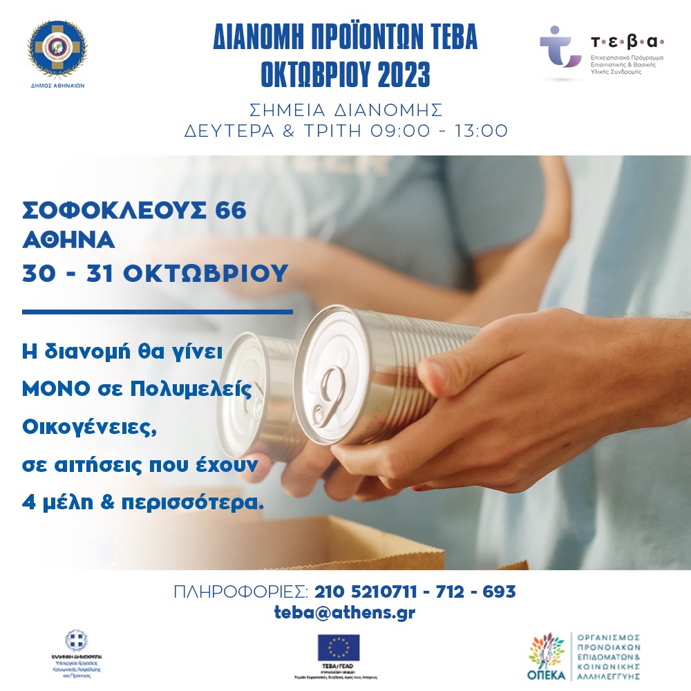 Η διανομή τροφίμων και ειδών πρώτης ανάγκης του προγράμματος επισιτιστικής βοήθειας ΤΕΒΑ θα πραγματοποιηθεί, τη Δευτέρα 30/10 και την Τρίτη 31/10 και ώρες 09:00-13:00 στη Σοφοκλέους 66.
