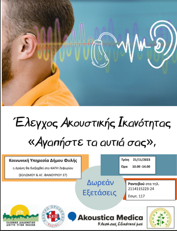 Η Δ/νση Κοινωνικής Προστασίας, Παιδείας και Πολιτισμού του Δήμου Φυλής, στα πλαίσια των δράσεων του ΕΔΔΥΠΠΥ και ΚΕΠ ΥΓΕΙΑΣ διοργανώνει για τους κατοίκους μέτρηση Ακουστικής Ικανότητας σε συνεργασία, με την εταιρία AKOUSTIKA MEDICA.