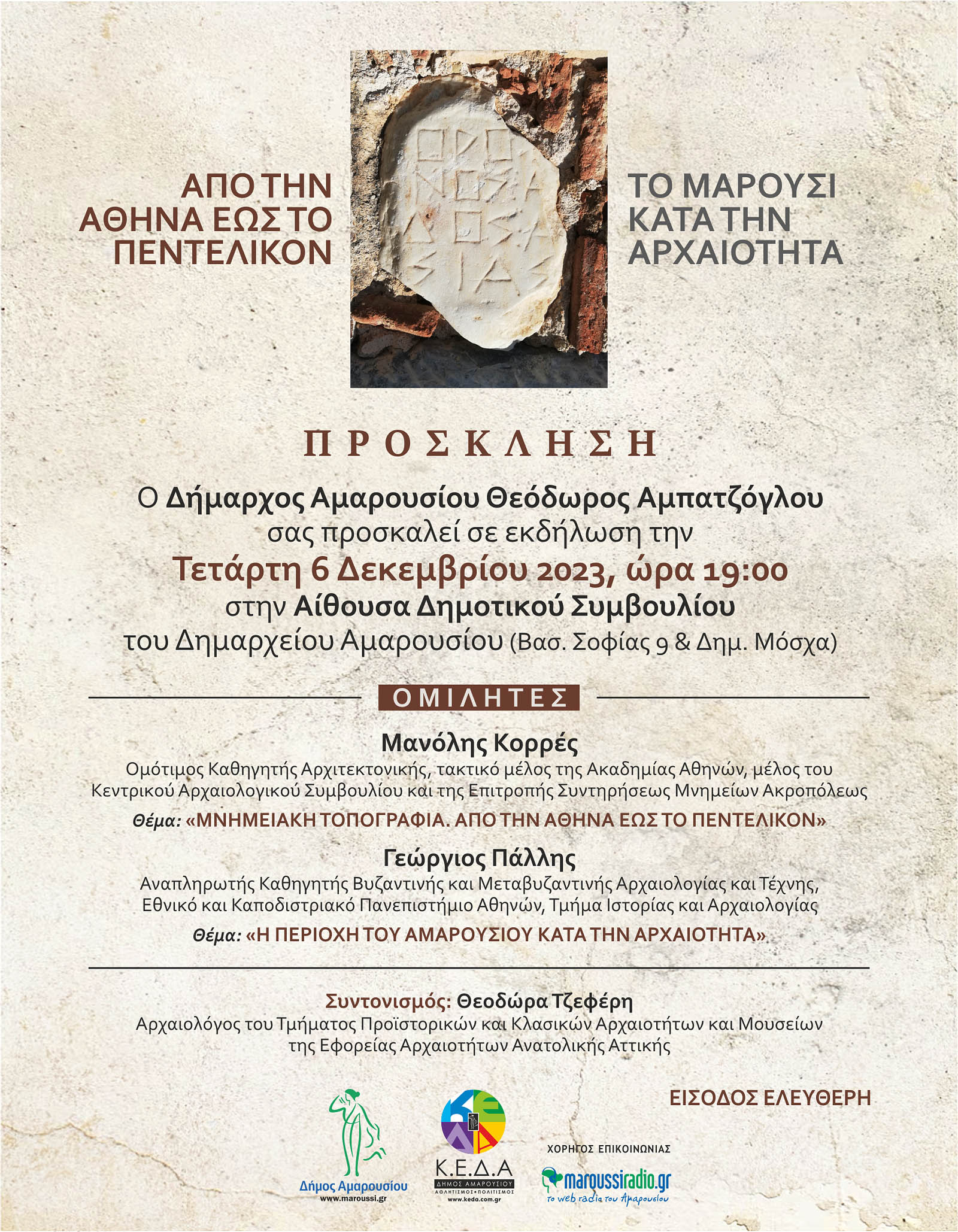 Ο Δήμαρχος Αμαρουσίου Θεόδωρος Αμπατζόγλου σας προσκαλεί σε μια ιδιαίτερα ενδιαφέρουσα εκδήλωση με θέμα: «Από την Αθήνα έως το Πεντελικόν. ΤΟ ΜΑΡΟΥΣΙ ΚΑΤΑ ΤΗΝ ΑΡΧΑΙΟΤΗΤΑ», την Τετάρτη, 6 Δεκεμβρίου 2023, ώρα 19:00 στην Αίθουσα Δημοτικού Συμβουλίου του Δημαρχείου Αμαρουσίου (Βασ. Σοφίας 9 και Δημ. Μόσχα).