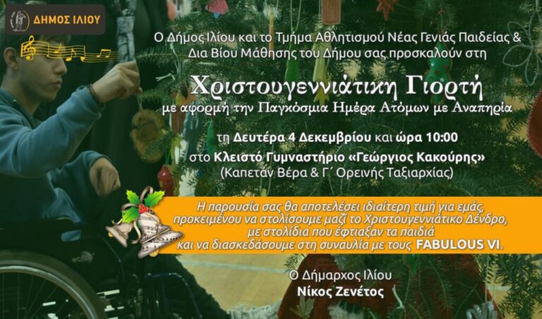 Χριστουγεννιάτικη Γιορτή με αφορμή την Παγκόσμια Ημέρα Ατόμων με Αναπηρία διοργανώνει στις 4 Δεκεμβρίου, ο Δήμος Ιλίου. Featured Top news ΔΗΜΟΣ ΙΛΙΟΥ