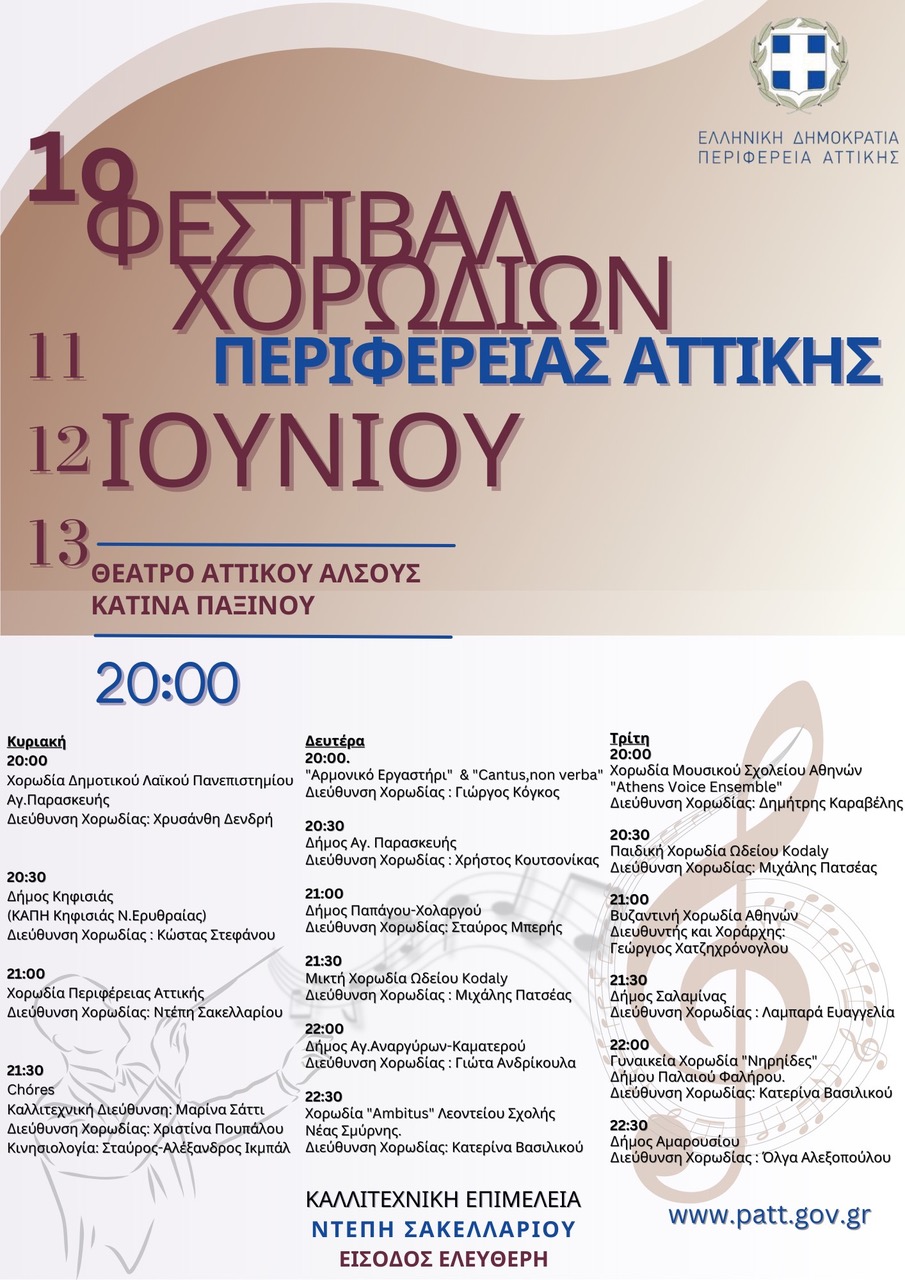 Η Περιφέρεια Αττικής κατόπιν σχετικής πρωτοβουλίας του Περιφερειάρχη Γ. Πατούλη διοργανώνει, το 1ο Φεστιβάλ Χορωδιών Περιφέρειας Αττικής στις 11- 12 και 13 Ιουνίου στο θέατρο Αττικό Άλσος, «Κατίνα Παξινού».