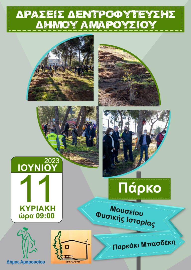 Ο Δήμαρχος Αμαρουσίου Θεόδωρος Αμπατζόγλου σας προσκαλεί, στη δράση δεντροφύτευσης στην περιοχή του Νέου Αμαρουσίου, στο πλαίσιο υλοποίησης ανάλογων δράσεων ανάπτυξης και ενίσχυσης του αστικού πρασίνου στις γειτονιές της πόλης, από τη διεύθυνση Περιβάλλοντος, του Δήμου Αμαρουσίου.