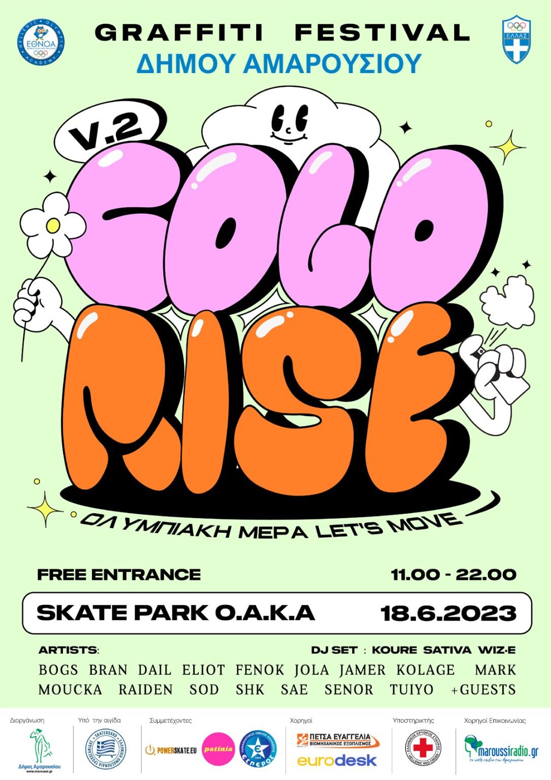 Ο Δήμαρχος Αμαρουσίου Θεόδωρος Αμπατζόγλου σας προσκαλεί στο 2ο Φεστιβάλ Γκράφιτι “Colorise Vol2”, που διοργανώνει ο Δήμος Αμαρουσίου, υπό την αιγίδα της Ελληνικής Ολυμπιακής Επιτροπής & της Εθνικής Ολυμπιακής Ακαδημίας και με τη συμμετοχή της Ελληνικής Ομοσπονδίας Τροχοσανίδας.