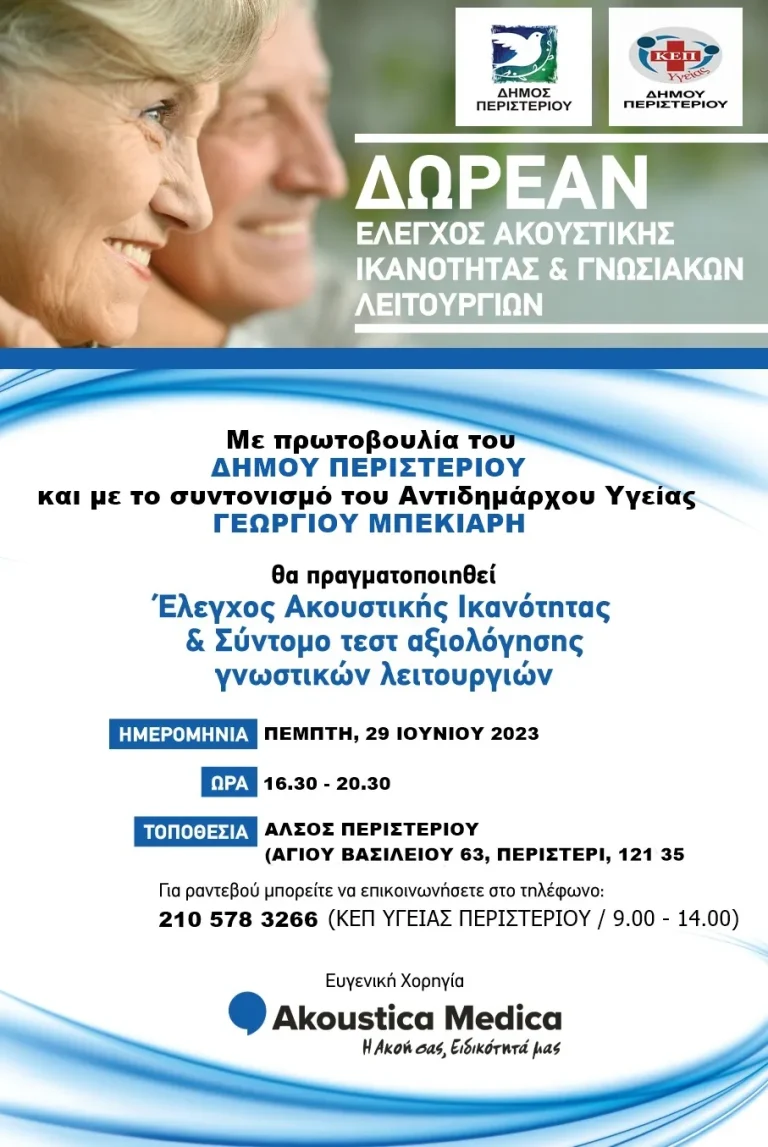 Μια πολύ ενδιαφέρουσα εκδήλωση, ανοιχτή για το κοινό, θα πραγματοποιηθεί στο Άλσος Περιστερίου, με αφορμή την Παγκόσμια Ημέρα Alzheimer και με σκοπό την ενημέρωση του κοινού για κάποιες σημαντικές παθήσεις της ακοής και των γνωστικών λειτουργιών.