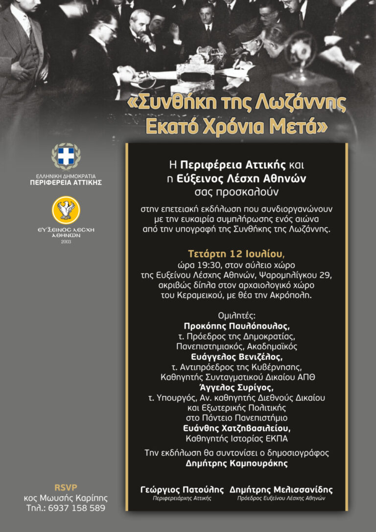 Η Περιφέρεια Αττικής και η Εύξεινος Λέσχη Αθηνών συνδιοργανώνουν επετειακή εκδήλωση με αφορμή τη συμπλήρωση των 100 χρόνων από την υπογραφή της Συνθήκης της Λωζάννης.
