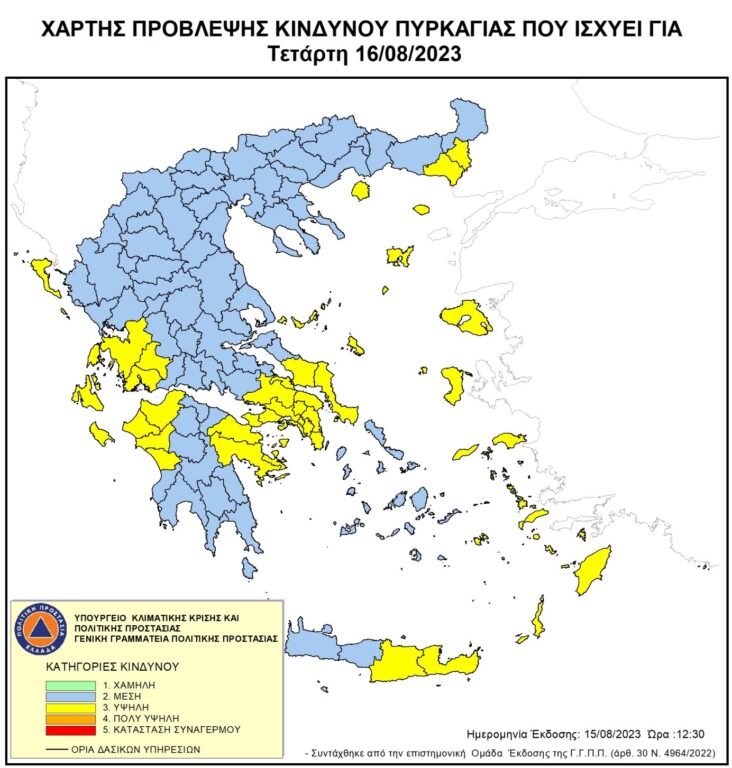 Σύμφωνα με το Χάρτη Πρόβλεψης Κινδύνου Πυρκαγιάς που εκδίδει η Γενική Γραμματεία Πολιτικής Προστασίας του Υπουργείου Κλιματικής Κρίσης & Πολιτικής Προστασίας (civilprotection.gov.gr), για σήμερα Τετάρτη 16 Αυγούστου 2023, προβλέπεται υψηλός κίνδυνος πυρκαγιάς (κατηγορία κινδύνου 3) για τις εξής περιοχές: