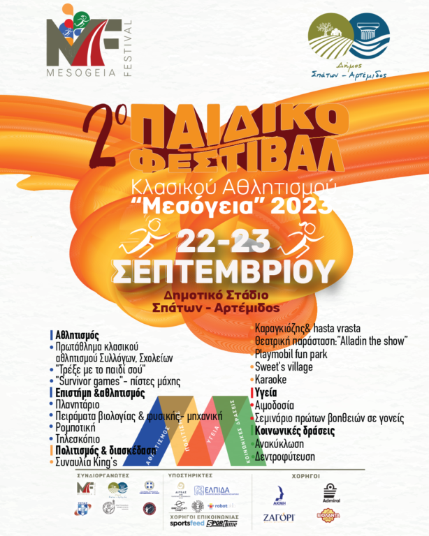 Το 2ο ΠΑΙΔΙΚΟ ΦΕΣΤΙΒΑΛ ΚΛΑΣΙΚΟΥ ΑΘΛΗΤΙΣΜΟΥ «ΜΕΣΟΓΕΙΑ» 2023 γίνεται σε συνδιοργάνωση με τους: ΦΕΣΤΙΒΑΛ ΜΕΣΟΓΕΙΑ, ΔΗΜΟ ΣΠΑΤΩΝ-ΑΡΤΕΜΙΔΟΣ, ΠΕΡΙΦΕΡΕΙΑ ΑΤΤΙΚΗΣ, Σ.Ε.Γ.Α.Σ, ΕΜΠΟΡΙΚΟ ΕΠΙΜΕΛΗΤΗΡΙΟ