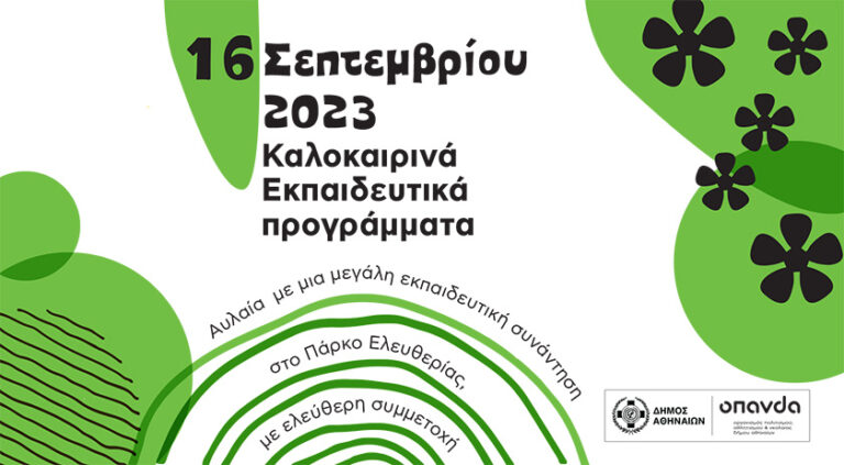 Με μια μεγάλη, εκπαιδευτική γιορτή ολοκληρώνεται το Σάββατο 16 Σεπτεμβρίου στο Κέντρο Τεχνών, στο ιστορικό Πάρκο Ελευθερίας, το πρόγραμμα των καλοκαιρινών υπαίθριων εκπαιδευτικών προγραμμάτων για οικογένειες με παιδιά ηλικίας από 6 έως 12 ετών, που διοργάνωσε, με δωρεάν συμμετοχή, ο Δήμος Αθηναίων, μέσω του Οργανισμού Πολιτισμού, Αθλητισμού και Νεολαίας του Δήμου Αθηναίων (ΟΠΑΝΔΑ), στους πράσινους κήπους και στις όμορφες αυλές των Μουσείων και των Χώρων Πολιτισμού της πόλης.