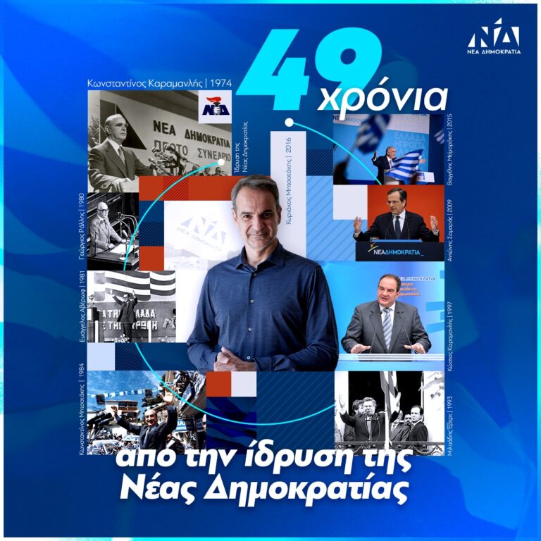 Σαράντα εννέα χρόνια μετά την ίδρυσή της από τον Εθνάρχη Κωνσταντίνο Καραμανλή, η Νέα Δημοκρατία εξακολουθεί καθημερινά να μεγαλώνει, διότι αντλεί δύναμη από τις ρίζες της και συνομιλεί με το σήμερα και το αύριο της πατρίδας και κάθε πολίτη ξεχωριστά. Και το αποδεικνύει έμπρακτα τα τελευταία τέσσερα χρόνια, με τις πολιτικές της Κυβέρνησης του Κυριάκου Μητσοτάκη που ενώνουν τους Έλληνες και αναβαθμίζουν την καθημερινότητα και τις προοπτικές όλων, σε ένα περιβάλλον αλλεπάλληλων εισαγόμενων κρίσεων.